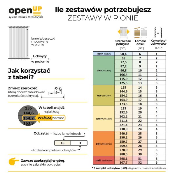 You can install aluminium blinds yourself. Do you need support in assembly? Take a look at guide. In it, we explain step-by-step how to assemble and install movable patio blinds. Before you order a set, calculate exactly how many you need. The table included in the download will help you to do this