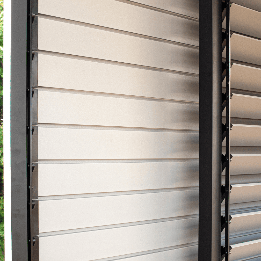 System przesuwny jest bardzo kompaktowy. Odstaje od konstrukcji jedynie na kilka centymetrów – mniej niż grubość ściany żaluzjowej. Doskonale się sprawdza na niewielkich przestrzeniach, gdzie przesuwne drzwi mają zdecydowaną przewagą nad klasycznymi. Dzięki temu możesz zabudować nawet wąski taras czy balkon.