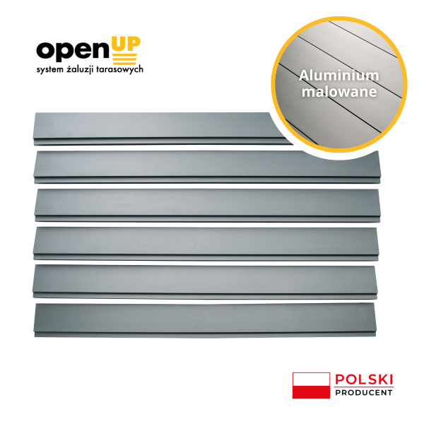 Lamela aluminiowa malowana do wypełniania ruchomych żaluzji zewnętrznych OpenUp System. Lamela jest kompatybilna z uchwytami OUS (OpenUp System).