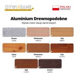 | Kolor aluminium drewnopodobnego | Brzoza_ Z2P26, Dąb_1_D1P11, Dąb_1_D1P7, Dąb_D4P27, Orzech_O2P19, Sosna_S1P3, Winchester_W2P22, Winchester_W3P23 |