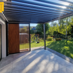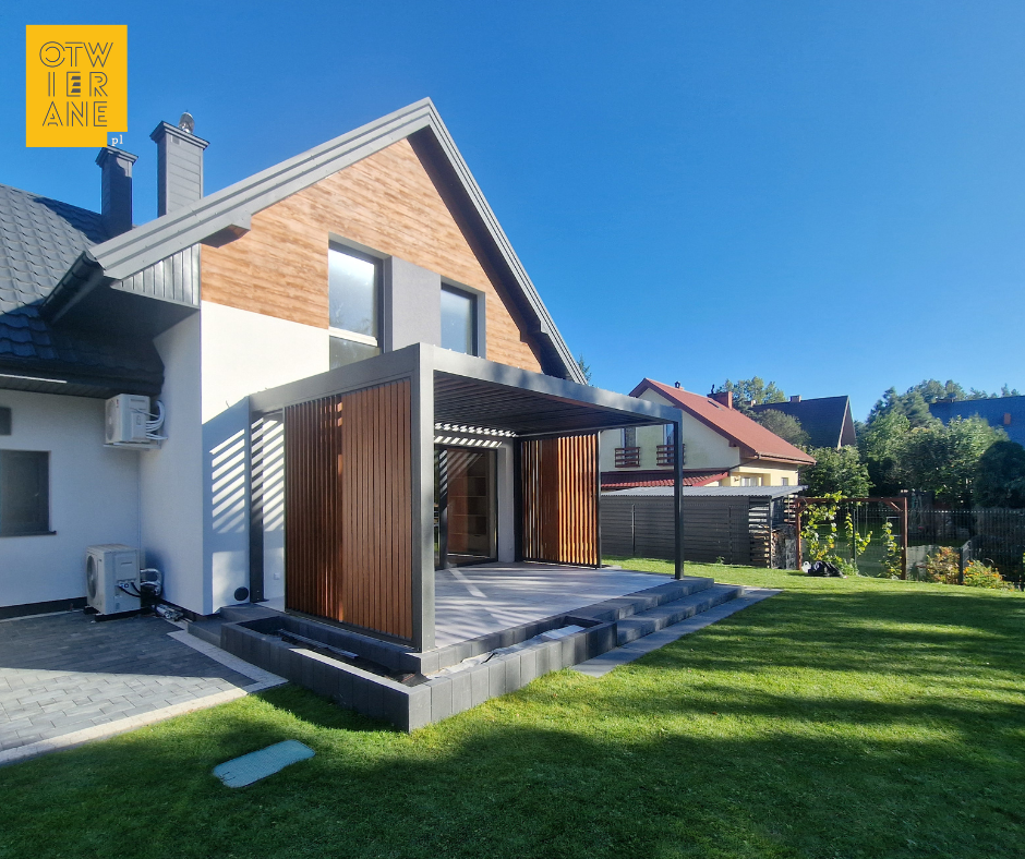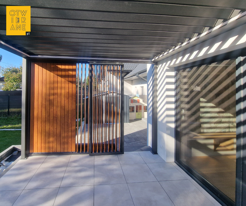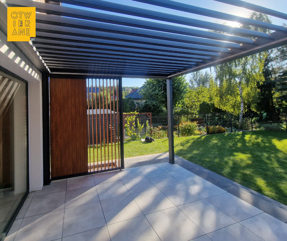 • Dach z lameli sterowanych elektrycznie – pióra w kolorze FSM 71319 Struktura zapewniają płynną regulację światła. W razie potrzeby dach można całkowicie zamknąć, chroniąc taras przed deszczem.