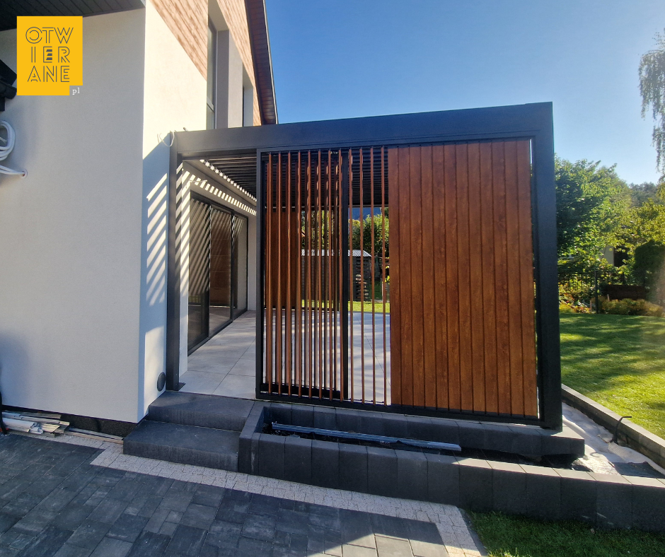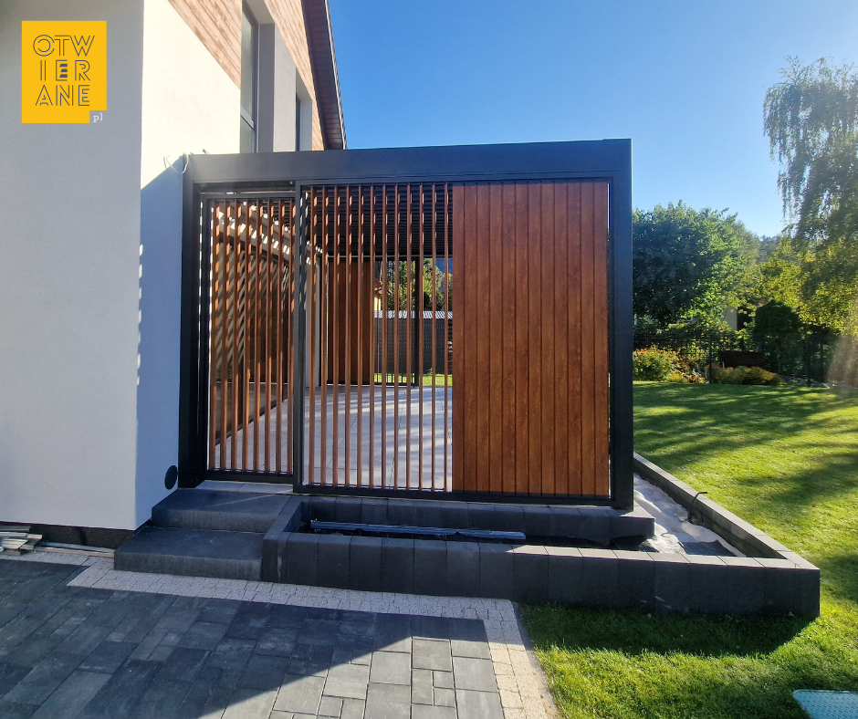 Zastosowane lamele aluminiowe drewnopodobne łączą trwałość aluminium z estetyką naturalnego drewna – nie wymagają konserwacji, są odporne na warunki atmosferyczne i zachowują swój wygląd przez lata.