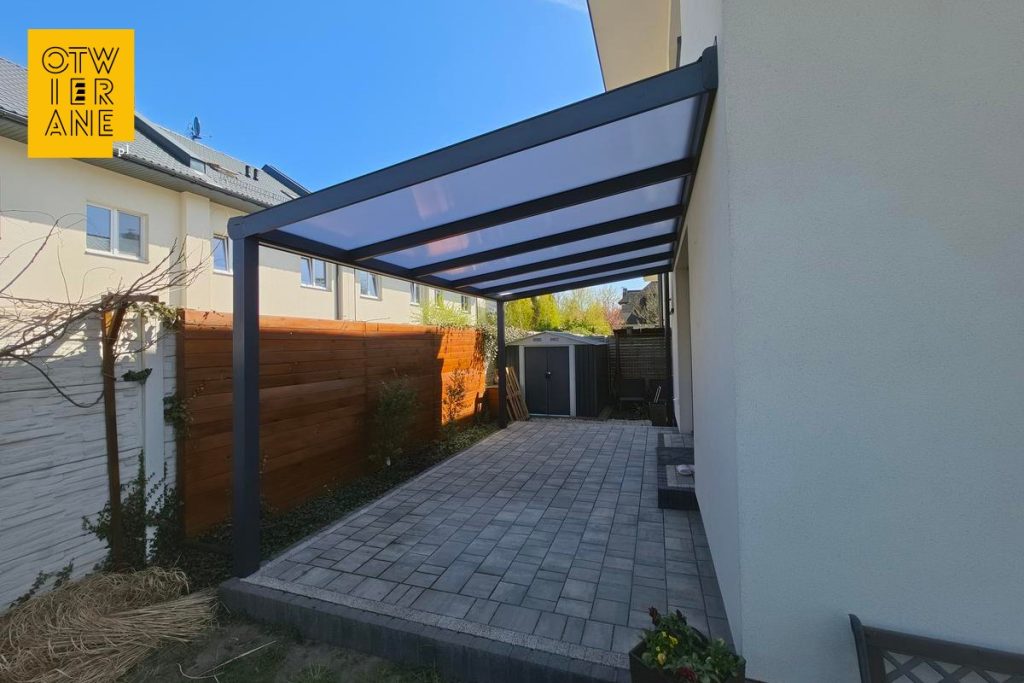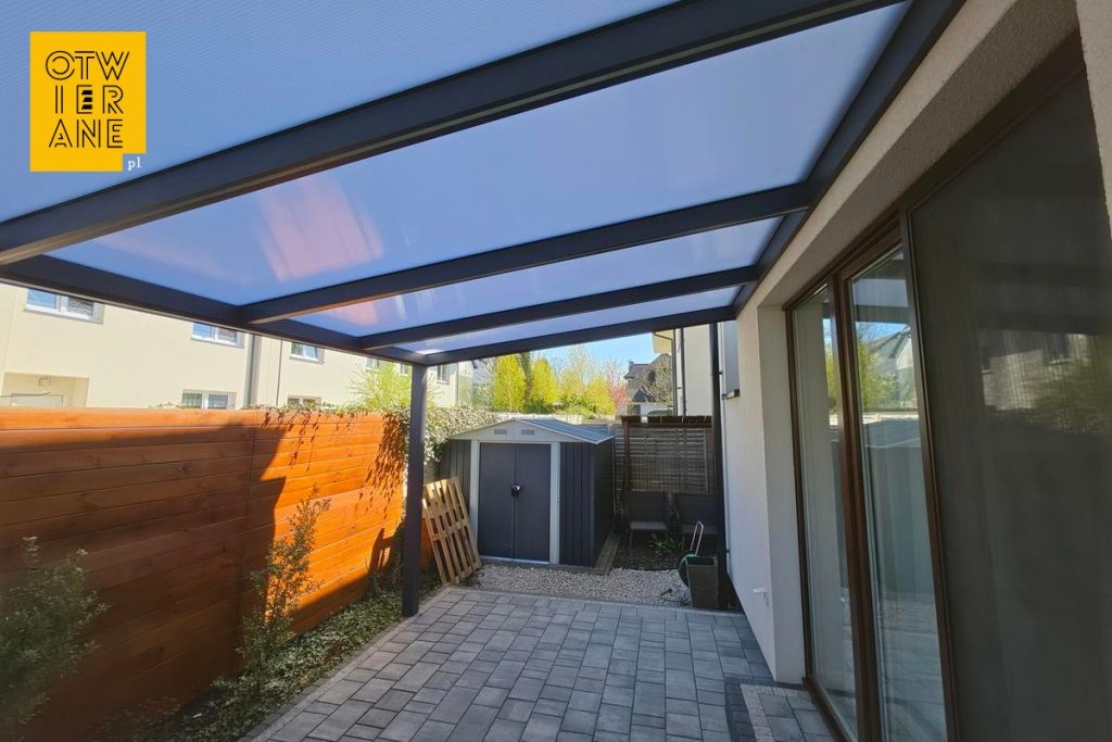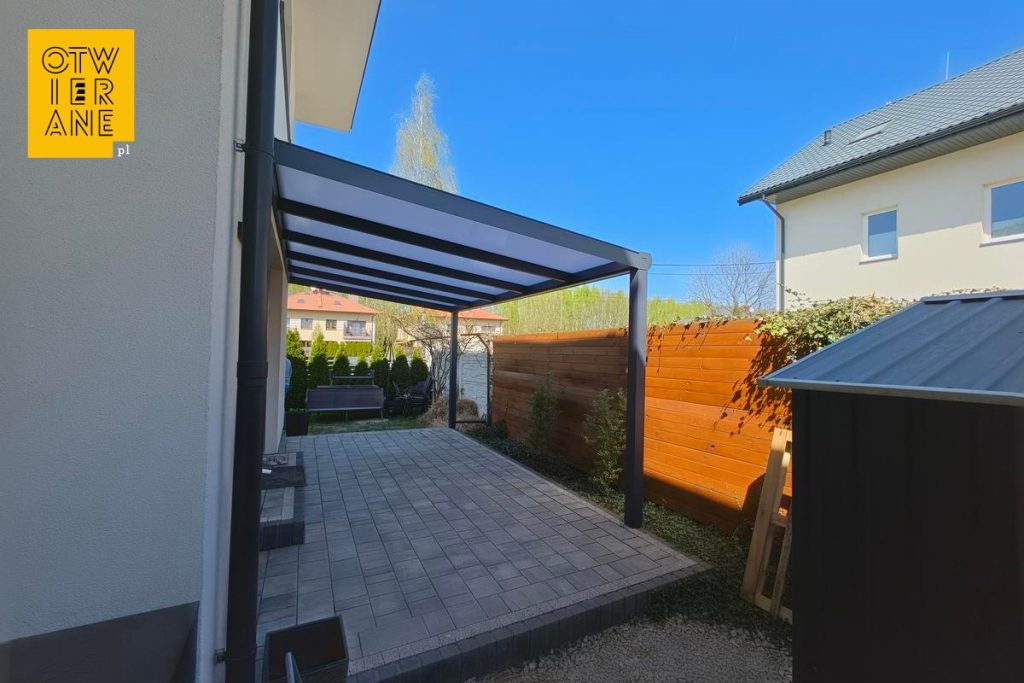 Ta realizacja łączy praktyczną ochronę tarasu z dopasowaniem do architektury budynku. Kolor RAL 7016 porządkuje wizualnie strefę przy elewacji, a mleczny poliwęglan utrzymuje pod zadaszeniem jasną, przyjemną atmosferę. Przemyślane detale, takie jak maskownica okrągła i oświetlenie LED, domykają całość funkcjonalnie i estetycznie.