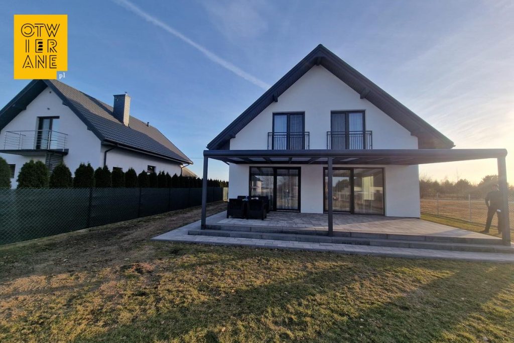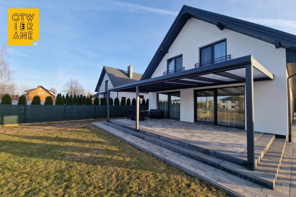Kolor profili RAL 7017 czytelnie koresponduje z ciemną stolarką i detalami dachu, a prosta, pozioma linia zadaszenia prowadzi wzrok wzdłuż elewacji. Przy jasnej fasadzie konstrukcja tworzy nowoczesną ramę dla wyjścia na ogród, jednocześnie nie przytłaczając bryły domu. Smukłe słupy ustawione przy krawędzi tarasu utrzymują przejrzystość strefy przy przeszkleniach, dzięki czemu elewacja pozostaje wyeksponowana.