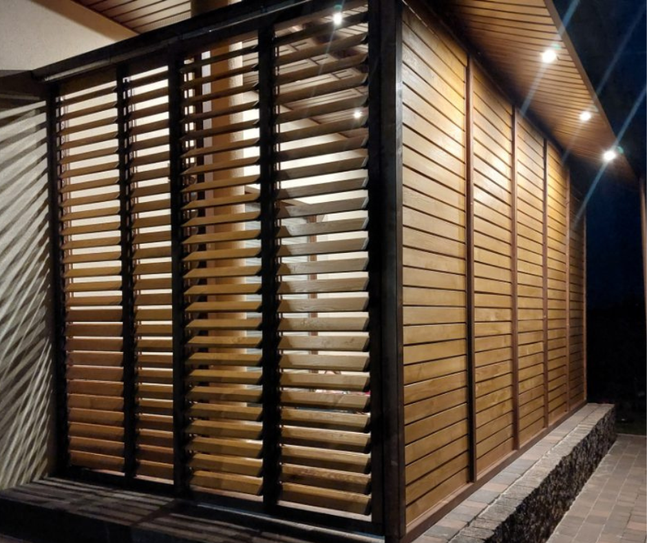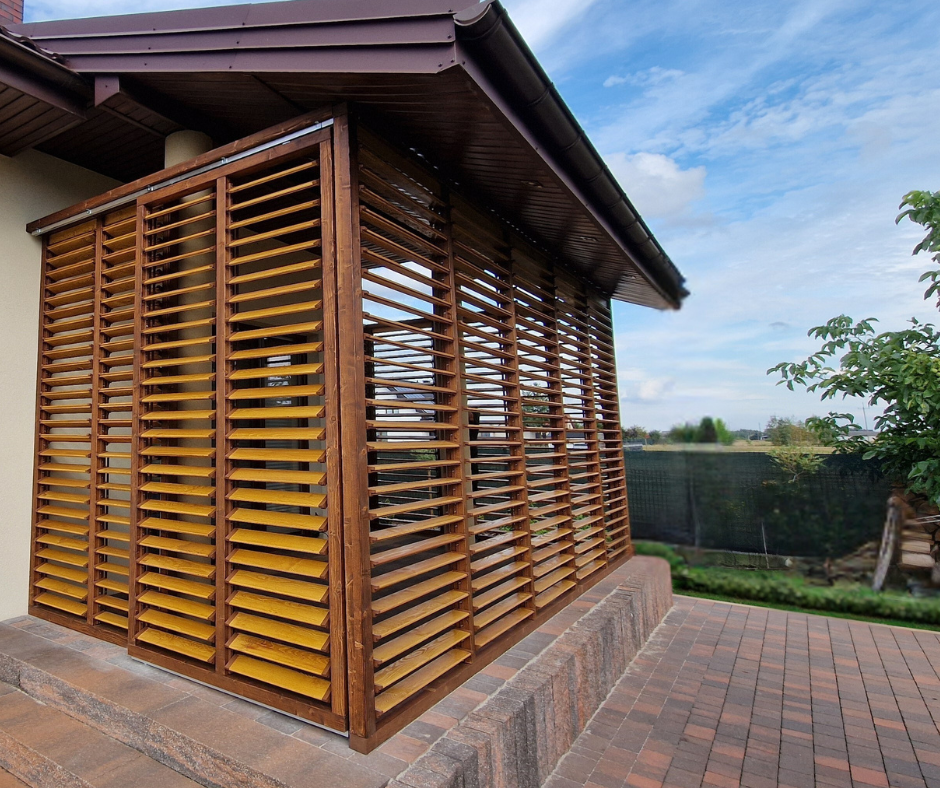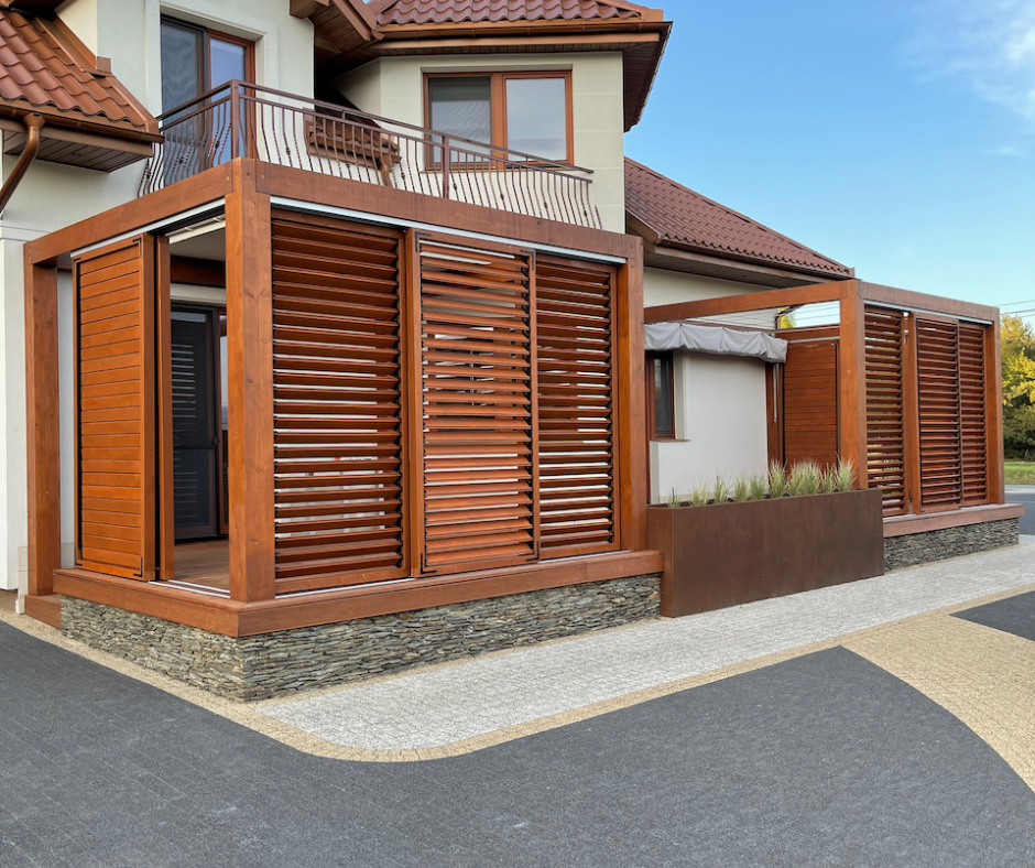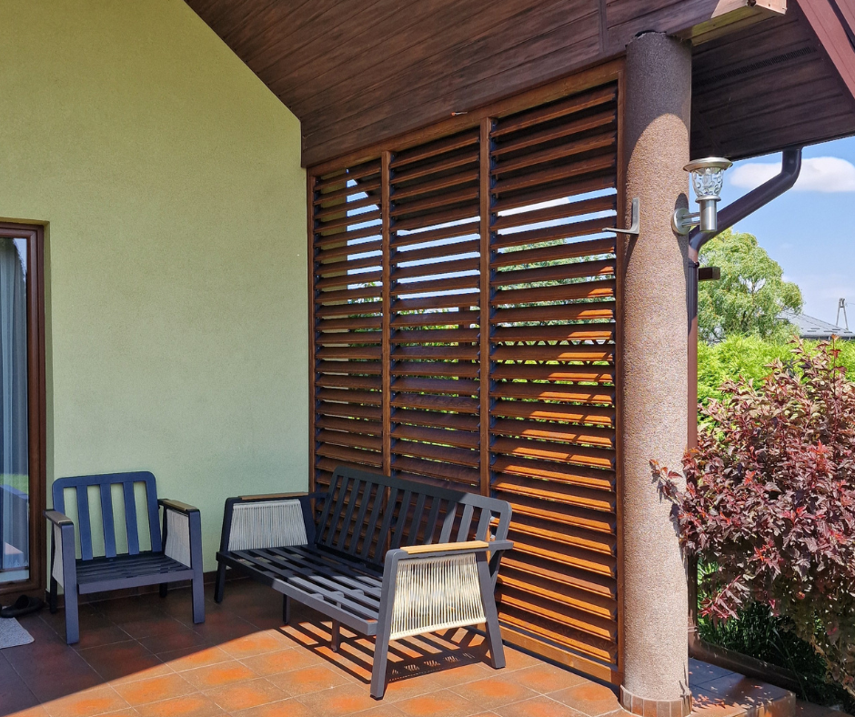 Drewniana zabudowa boczna tarasu lub balkonu żaluzjami: