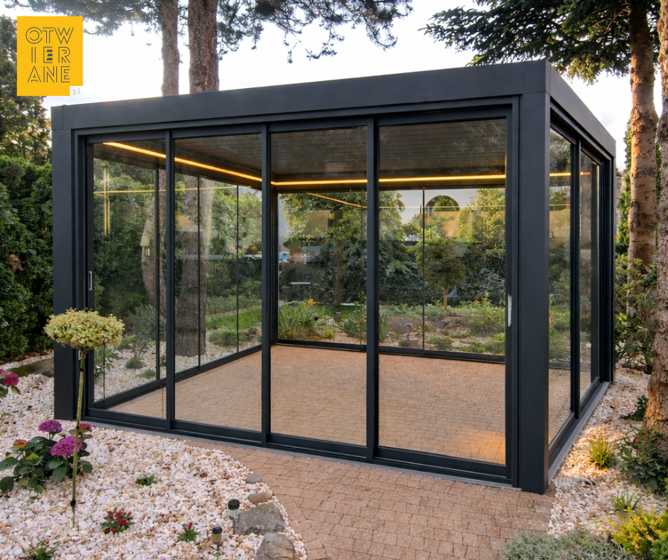 Szklane skrzydła przesuwają się bez ram, co zapewnia maksymalną przejrzystość i niezakłócony widok na ogród. To rozwiązanie dla osób, które stawiają na otwartą przestrzeń i efekt „pełnego szkła”.