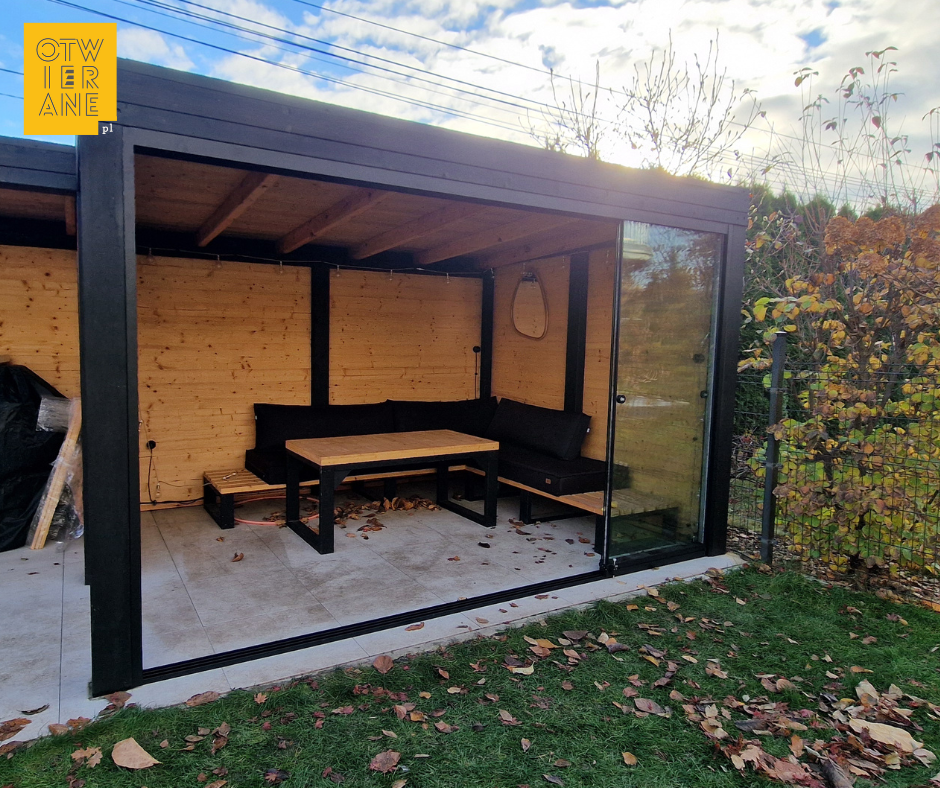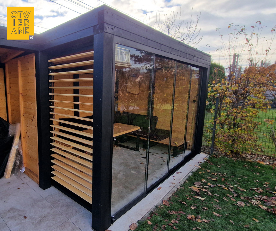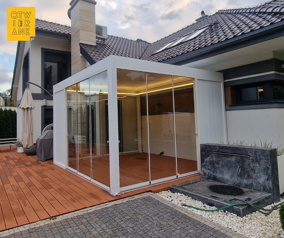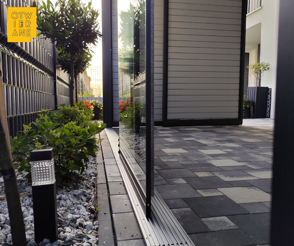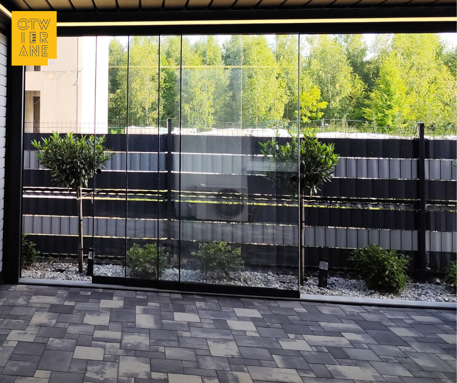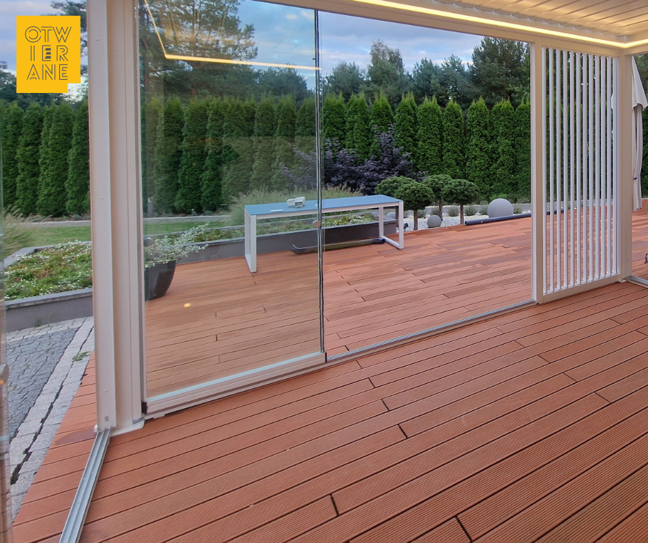 Dla wygody użytkowników instalujemy na szklanych taflach uchwyty do otwierania ich. Takie bezramowe panele przesuwne pozwolą Ci cieszyć się wypoczynkiem na zadaszonym trasie od wczesnej wiosny, do późnej jesieni.
