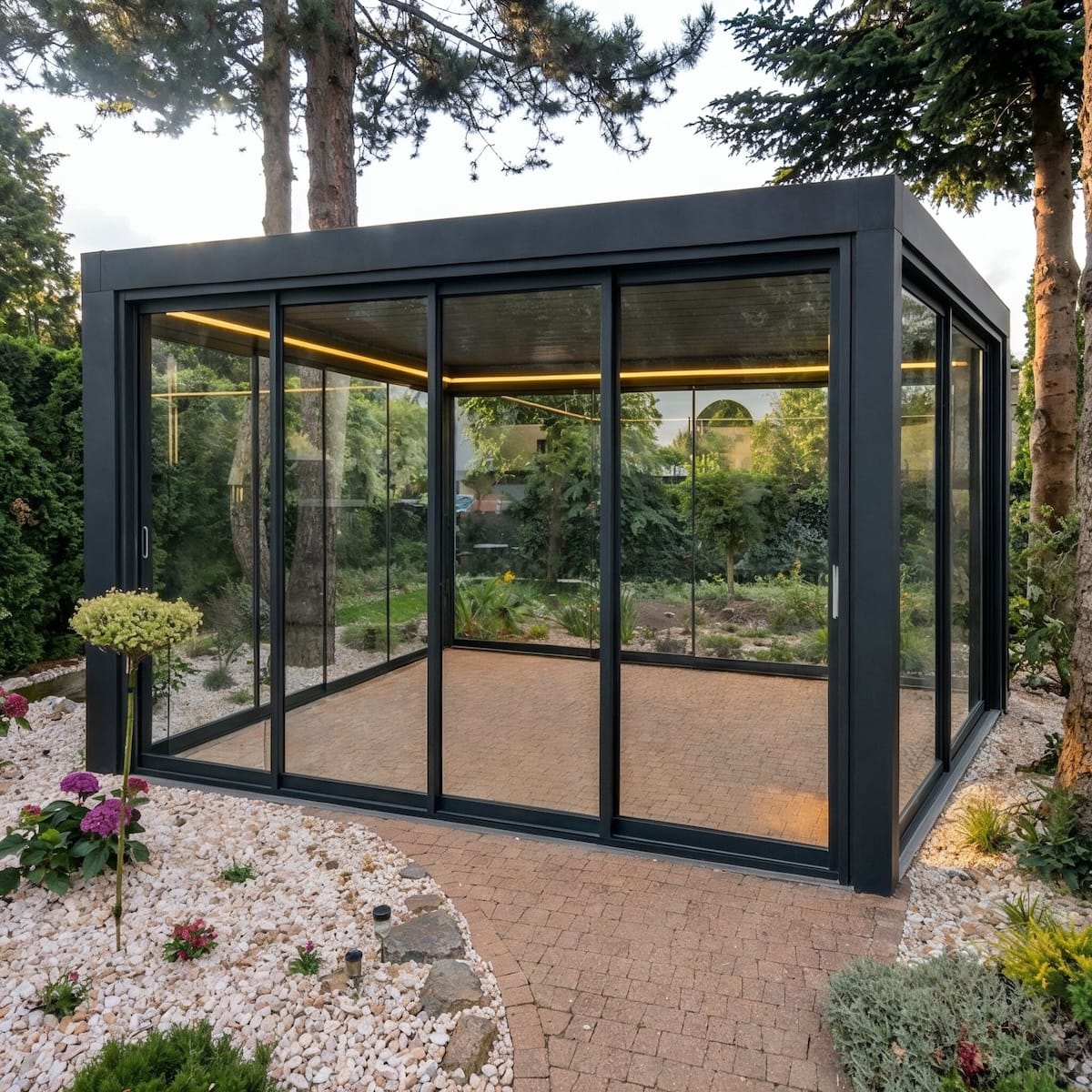 Szklane skrzydła przesuwają się bez ram, co zapewnia maksymalną przejrzystość i niezakłócony widok na ogród. To rozwiązanie dla osób, które stawiają na otwartą przestrzeń i efekt „pełnego szkła”.